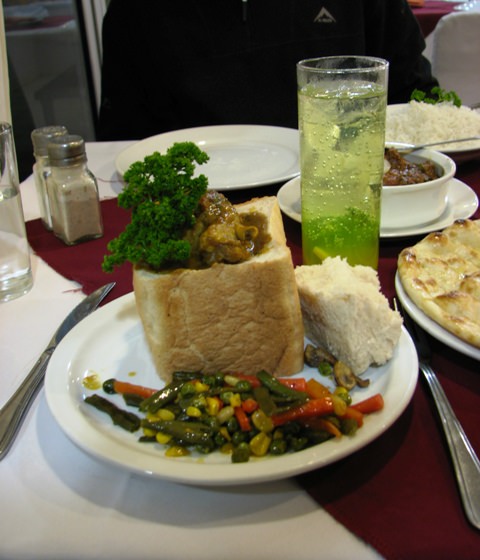 We ate our last dinner in Durban at the same place where we ate our first – Al-Mehran. I finally had a Durban bunny chow and it didn’t disappoint. It was further enhanced by a passion fruit cola — a magical concoction of passion fruit juice, cream soda (which is fluorescent green here), and lemonade, with a twist of parsley and lemon. Perfection.