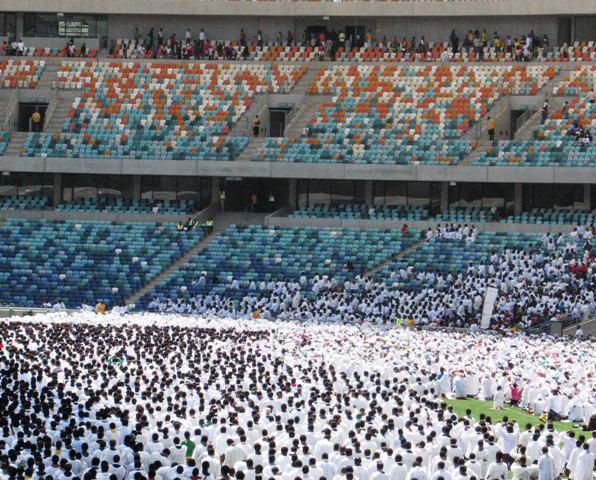 1) A religious service by the leader of Shembe, the Zulu Nazareth Baptist Church. Thousands of church followers knelt in the stadium infield, all dressed in white smocks. They sang hymns and blew horns that were similar to vuvuzelas, just larger and less annoying.