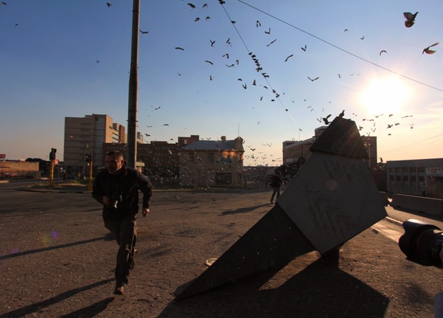 A block from Old Chinatown, at the intersection of Main Road, Main Reef Road, and Miriam Makeba Street, is a piece of pavement known as Pigeon Square. The square, which is actually a triangle, serves as a resting and feeding place for city pigeons. Three sculptures, inspired by pieces of origami, were recently placed there, each one covered with perches for roosting pigeons. Joe ran through the flock of pigeons to create a photo-op; it looks like he was fleeing gunfire.