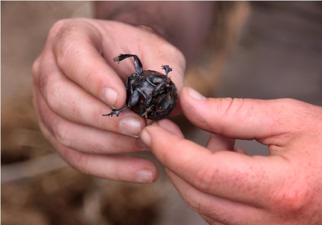 Brian shows us the bottom of a huge dung beetle. We caught this beetle trying to roll a piece of elephant dung the size of a cantaloupe. He eventually gave up and crawled away.
