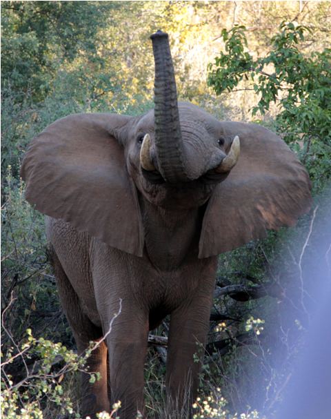 A few of us were goofing off in the back of the line, when we rounded a bend and came upon a bull elephant in full musth. This basically means the elephant was in a very bad mood. He raised his trunk at us and flared his ears. Brian spoke to the elephant very calmly and it seemed to placate him a bit. We backed off slowly and moved to higher ground.