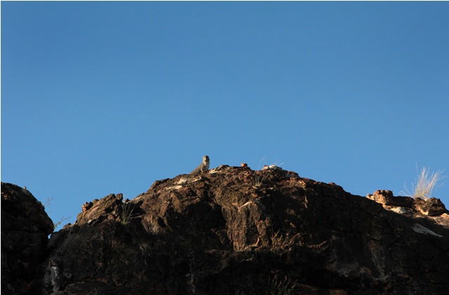 A rock hyrax (kind of like a rock-climbing prairie dog) peaks at us from above.