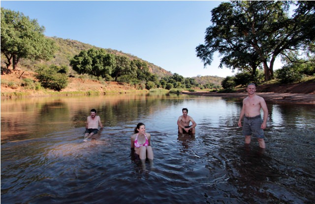 Brian (left), me, Chris, and Matthew, relaxing in the Luvuvu after a 12-kilometer hike and several near-death experiences. Brian assured us the water was too shallow for crocs. How often does one get to swim in an African River? (Photo courtesy of David Park)