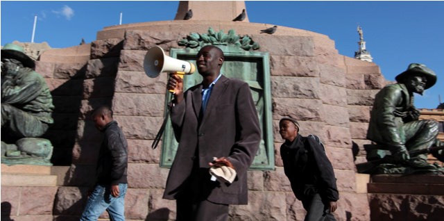 An energetic and articulate street preacher entertains the crowd in Church Square.