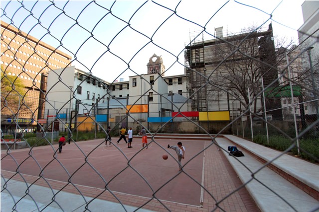 Basketball in Oppenheimer Park. In the background you can just see the tower of the Rissik Street Post Office, one of Joburg’s most historic buildings, which has long stood unoccupied and was gutted by fire last year. The post office is currently surrounded by scaffolding, a hopeful sign that it might soon be renovated.