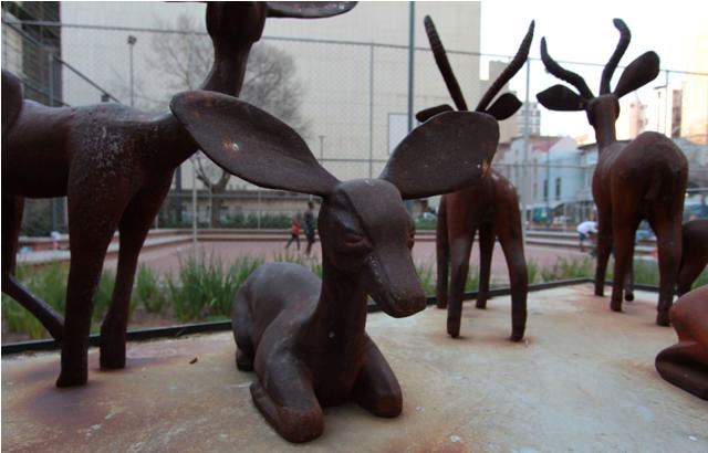 Cast-iron impala statues watch over the basketball court. This used to be the site of an older, more famous impala statue, which was vandalized and eventually moved to Main Street. (Here’s my pic of the old statue in its new location.) I’m quite fond of both the new and the old statues.