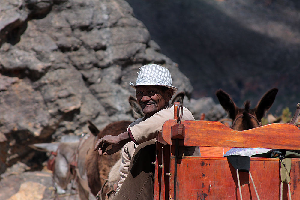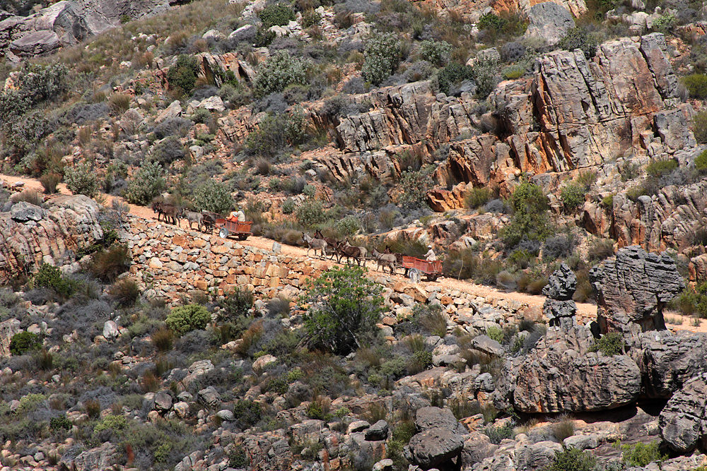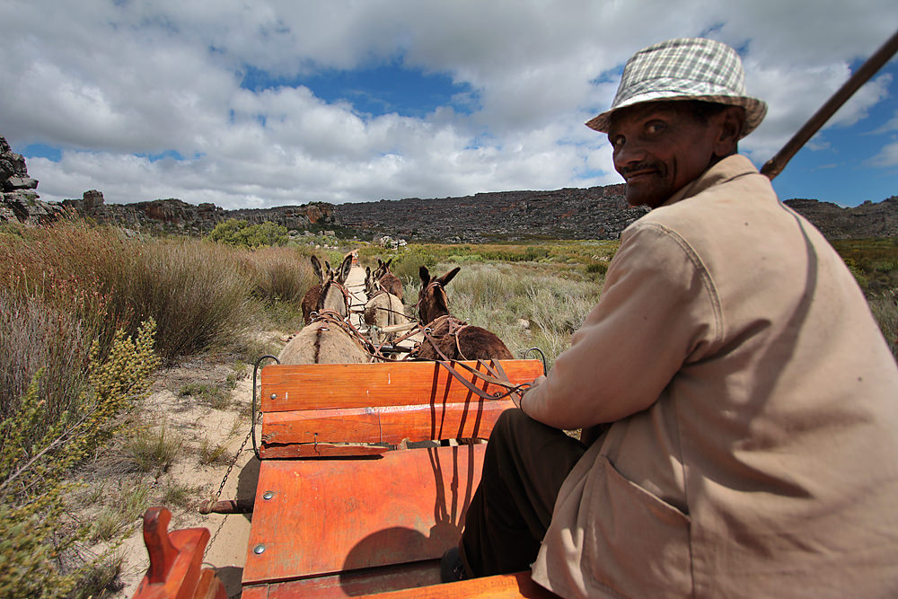 This is the part of the trip I looked forward to the most. We would travel 12 kilometers from the top of Pakhuis Pass to the village of Heuningvlei, riding/walking with donkey carts — the traditional mode of transport for people living in the Cederberg. We arrived at the top of the pass and met Devon and Johannes, the donkey cart drivers. They loaded our luggage onto the carts and motioned for us to climb aboard.