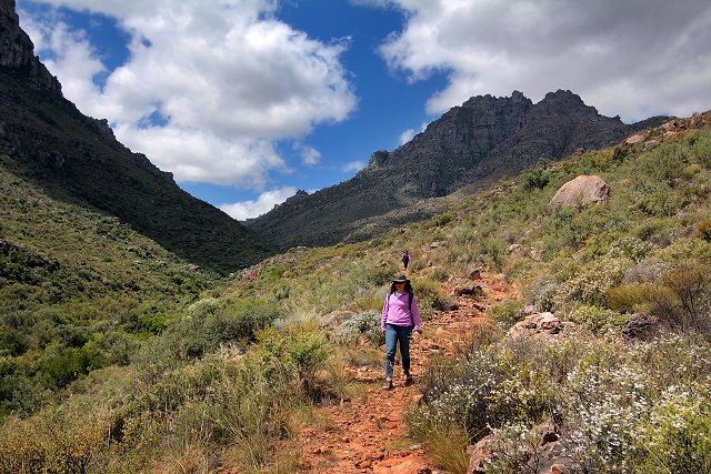 Michelle (foreground) and Nina (distant speck) hike down from Krakadouw Pass.