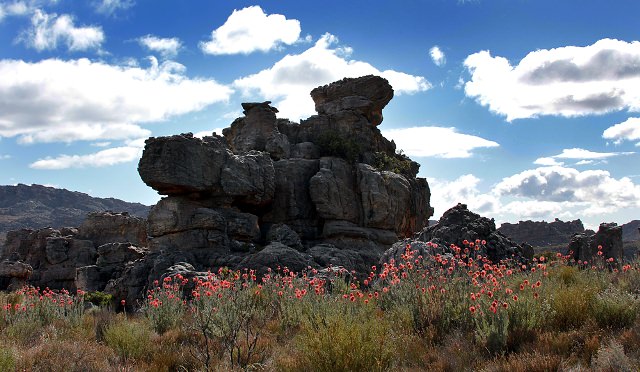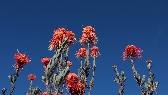 We wandered into a sea of giant red flowers. The African name for the flowers is perdekop, Abraham told us. The scientific name is Leucospermum reflexum. Perdekop is a threatened species and exists only in the Cederberg. There is also a yellow species of perdekop, which is so rare that only five or six clutches of them still exist. We saw one group of yellow perdekop far in the distance.