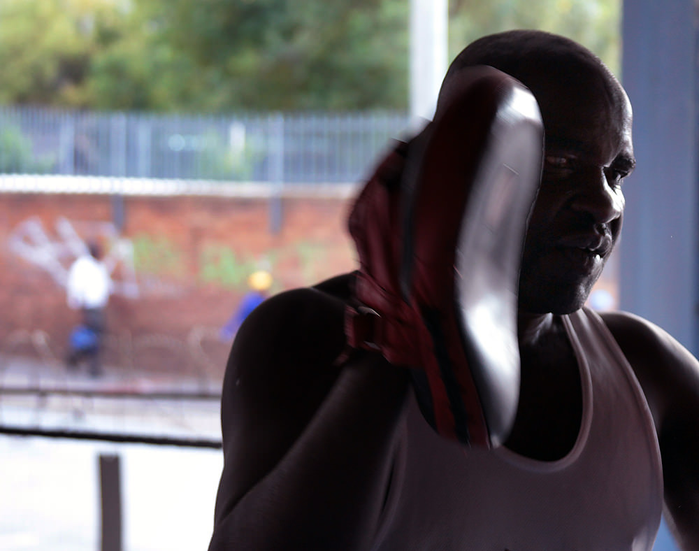 But if George’s clients want to experience what real boxing training is like, working alongside professional boxers and sparring in an actual ring, they have to go to the Hillbrow Boxing Club. One or two days a week, we work out there.