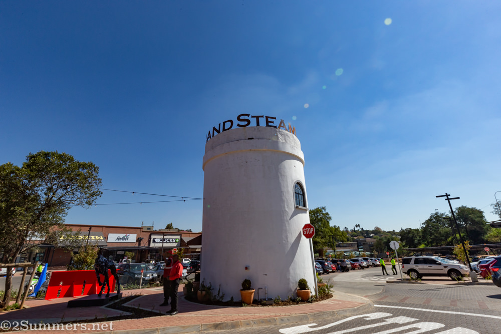 But I went to Rand Steam for the first time this week and I have to admit, the place is nice. Joburg has a lot of shopping centres but this is the only Joburg shopping centre I know of that has a blue heritage plaque, a beautiful artistic tribute to the original heritage of the site, and a century-old white-washed filtration tower that has been turned into a hip shoe shop.
