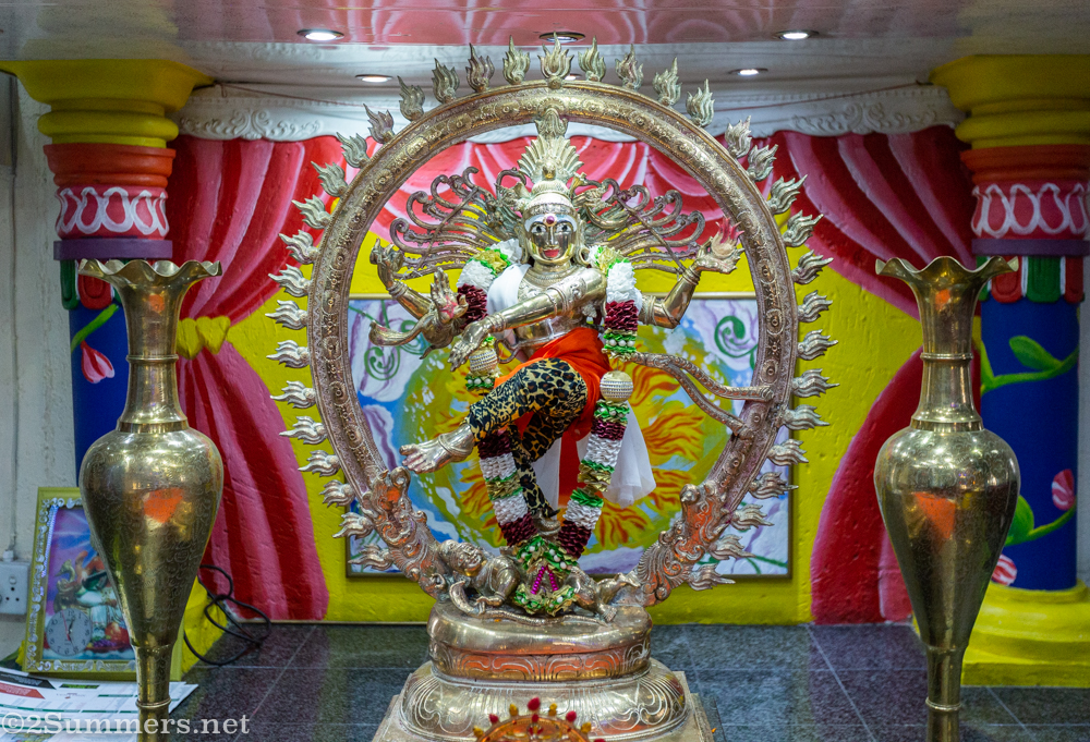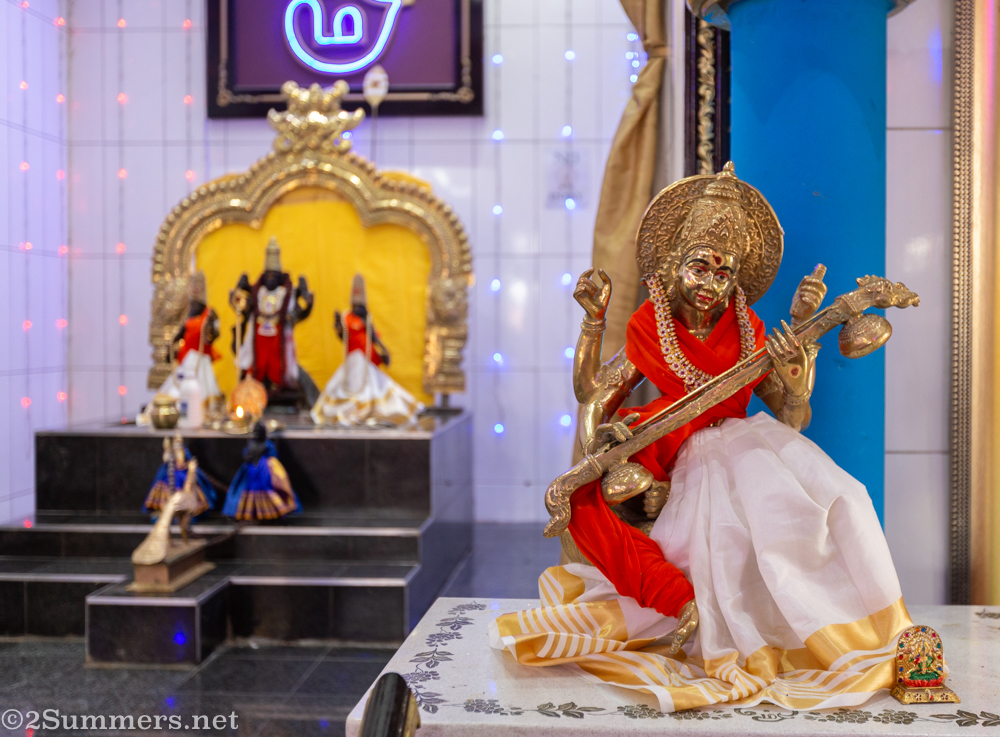 There were lots of people at the temple — staff members, worshippers, and children/teachers attending the Saturday Tamil school — who eagerly welcomed us in to wander about as we pleased. We examined the murti from below and also climbed the platform (after taking our shoes off) to see the murti up close and check out the beautiful shrine behind it.